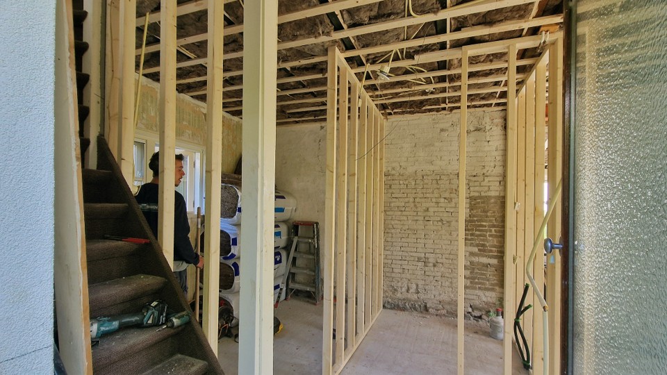 De Stichting Rijnenburgermolen is eigenaar van zowel de molen als de voormalige molenaarswoning. Deze is van 2015 tot 2023 m et succes ingezet als vakantiewoning en soms ook om bijvoorbeeld te dienen als “overbrugging” tussen twee woningen. De fundering werd echter zo slecht dat er substantiële ruimte ontstond tussen de aanbouw (uit 1974) en de oorspronkelijke woning (uit 1932) Gekozen is om een nieuwe fundering te leggen (van binnenuit) waarbij uiteindelijk 6 palen van 13 meter lengte zijn aangebracht met daarop een draagvloer die verdere verzakking voorkomt. Daartoe moest de volledige begane grond inclusief vloeren en muren worden verwijderd (foto 1) en de dragende constructie worden aangebracht (foto2) Van de gelegenheid is gebruik gemaakt om de woning van het gas af te halen zo veel mogelijk isolatie in vloer, wanden en plafonds aan te brengen (foto 3).Vloerverwarming is direct aangebracht. Daarna is de woning door vrijwilligers weer in bewoonbare staat omgetoverd (foto 4). Vloeren, toilet, douche en een nieuwe keuken (foto 5) , schilderwerk enz. maken de woning weel helemaal up-to-date. Zoveel mogelijk is gebruik gemaakt van overheidssubsidies voor een wamtepomp, isolerend glas en vloeren.